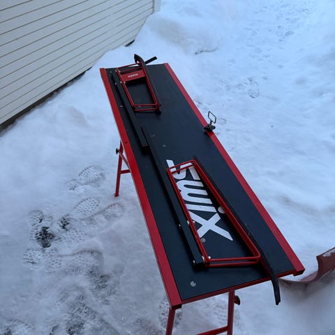 Swix smørebord for ski i rød og svart. Bordet har sammenleggbart stativ og solid bordplate med Swix-logo. Integrerte støtter i hver ende er tilpasset feste og stabilisering av ski under prepping og smøring. Egnet for bruk i smørebod, garasje eller andre innendørsmiljøer der man trenger en fast arbeidsstasjon til vedlikehold av ski.