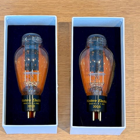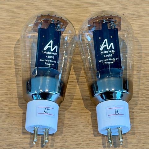 Selger et matchet par KR Audio 300B. Fantastiske rør, brukt mindre enn et halvt år i min Audio Note Meishu Tonmeister. Jeg foretrakk disse foran Audio Note sine egne 4300E og Western Electric 300B.