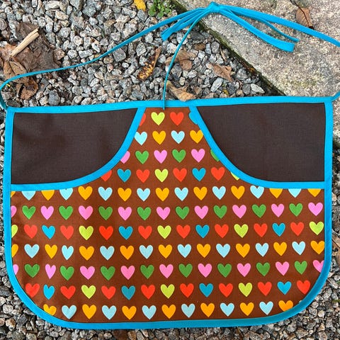 Kan brukes på begge sider, én lomme på den ene siden, to lommer og ekstra forkle-lag i blomstret stoff på den andre.