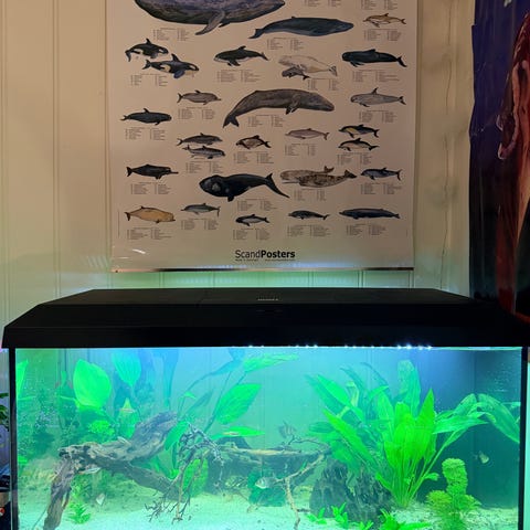 Juwel akvarium med tilhørende underskap i svart utførelse. Akvariet har rektangulær form med glassvegger og toppdeksel i plast med integrert belysning. Innvendig er det lagt brun/grusaktig bunnsubstrat. I bakre hjørne er det innebygd filterløsning, og det følger med ekstra filterpatroner som vises på bildene. På underskapet er det hylleplass til utstyr, blant annet pumpe eller annet tilbehør. Egner seg til innendørs bruk som akvarium for ferskvann eller eventuelt andre tilpassede bruksområder etter behov.