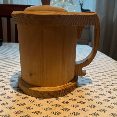 Rund kaketine med løst lokk og bærehåndtak. Boksen er laget i tre og måler omtrent 32 cm i diameter.