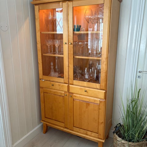 Elegant vitrineskap i heltre – med glasshyller og stemningslys