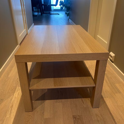 Fint eikebord som kan brukes til sofabord eller som et hjørnebord.