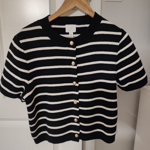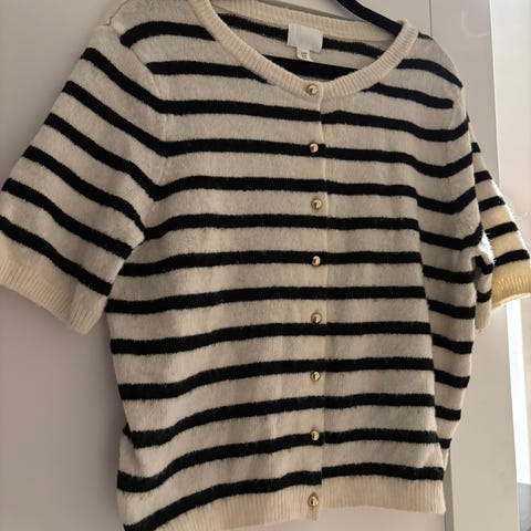 H&M Boucléjakke i størrelse M. Modell med korte ermer og krage. Jakken er offwhite med svart farge langs knappestolpe, krage, ermer og lommedetaljer. Lukkes med knapper foran. Materiale: 100 % polyester.