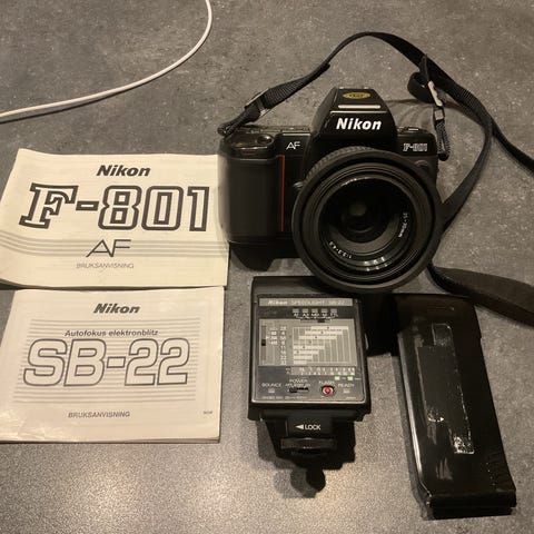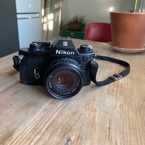 Nikon Fm med linse selges. Lysmåler fungerer. Viewfinder er skitten og kamereaet trenger nye pakninger. Forhåndsvisningsspak for dybdeskarphet har knukket, men er limt på plass. Den er limt fast, så spaken fungerer derfor ikke lenger. Se bilder. Heldigvis kanskje ikke den funksjonen man bruker mest. Det følger med en "enkel" kamereaveske. Se bilder. Linsa heter "Nikon Lens Serie E 50 mm 1:1.8".
