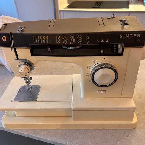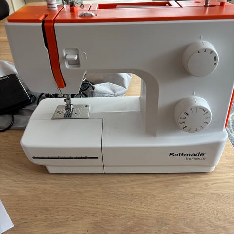 Kompakt elektrisk symaskin i hvit plast. Maskinen har flere sømprogrammer som velges med dreiehjul på siden, og enkel betjening med håndhjul og start/stopp-bryter. Den leveres med fotpedal og strømadapter. På fronten er det markeringer for ulike stingtyper, og på basen er det måleskala for enklere oppmåling av stoff. Egnet til enklere sømarbeid og reparasjoner i hjemmet.
