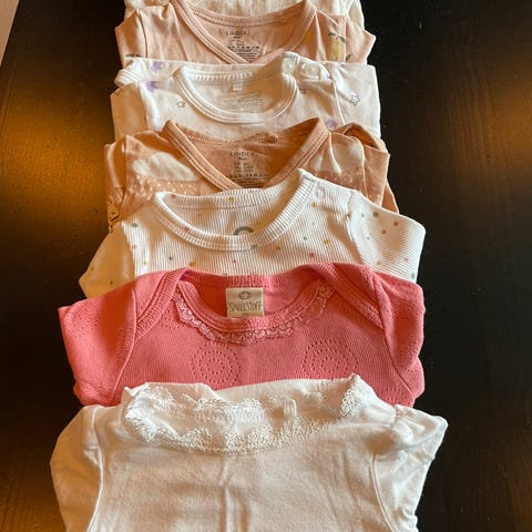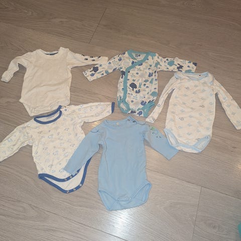 Selger bodyer med lange ermer og bukser. Passer til størrelse 62–68. I god stand, uten flekker. Fra et hjem uten dyr og røyk. Kan hentes i Drøbak eller sendes med post.