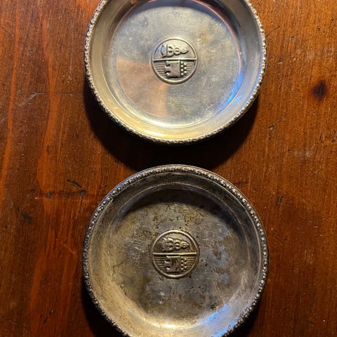2 stk. sølv (830s) askebegre med påsatt emblem i midten. Diameteren er ca. 6,5 cm og vekten er 22g på hver av de to. Kan hentes eller sendes for kjøpers regning og risiko. Prisen gjelder for begge.