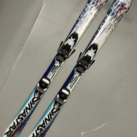 Rossignol Radical RSX barneski med Look-bindinger i lengde 120 cm. Alpinski for barn, med integrerte Look Team 4-bindinger. Skiene har farger i rød, blå, hvit og svart, og er egnet til bruk i preparerte alpinbakker. Undersiden er sort med tradisjonelt spenn og sidekant for kontroll på hardt underlag. Alt virker, men noe har ramlet av foran på bindingen, se bilde.