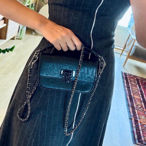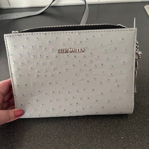 Steve Madden skulderveske for dame i svart kunstlær. Vesken har buet fasong og leveres med både kort skulderlenke i metall og bred, justerbar tekstilreim som kan tas av. Det følger med en liten avtakbar lomme/pouch i samme materiale som kan festes på reimen. Hovedrommet lukkes med glidelås, og det er dekorative detaljer i flerfarget materiale langs åpningen. Egnet som hverdagsveske eller til enklere bruk der det er behov for å ha med nødvendigheter som mobil, nøkler og småting.