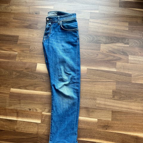 Jeansen har en flott vask, behagelig stretch og en passform som fungerer både til hverdags og mer dressede antrekk. Like fin med sneakers som med loafers eller blazer. Er et lite merke på høyre lår etter telefon.