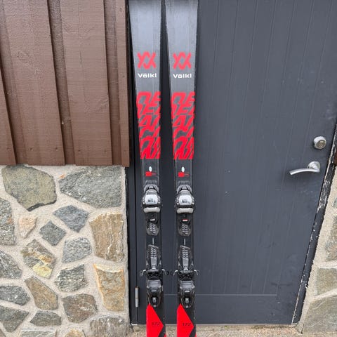 Skiene har grå overside med røde detaljer og svart såle med røde felt i toppen. Montert med alpinbindinger (se bilder for modell og innstillingsområde).