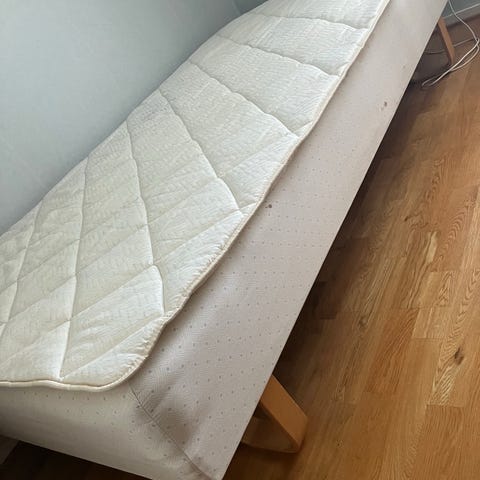 Jensen rammemadrass. Rammemadrassen har integrert treramme med fjærende kjerne og tekstiltrekk. Undersiden består av en fast ramme med trespiler, mens sidene og oversiden har polstret trekk. Egner seg som sengeløsning alene eller sammen med overmadrass og ben eller sengegavl etter behov. 2 stk a 90 cm. Det hvite trekket er avtagbart og kan vaskes (noe vi ikke har gjort). Fraktes til Trondheim søndag 8.februar, så hvis noen på strekket Oppdal-Trondheim ønsker de levert er det mulig.
