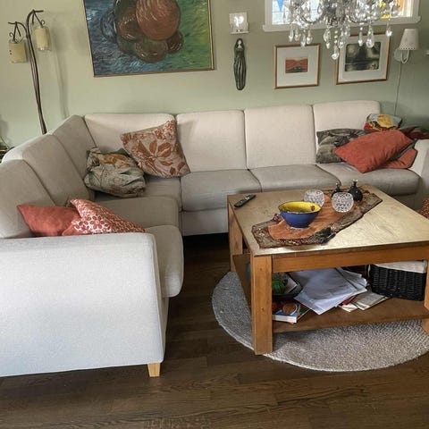 Sofaen trenger rens/vask. Putetrekk kan tas av og vaskes i maskin. To av putene trenger ny glidelås. Selve skummet i putene er intakt, og sofaen er god å sitte i.