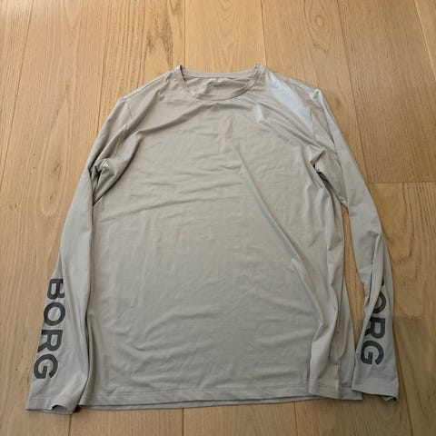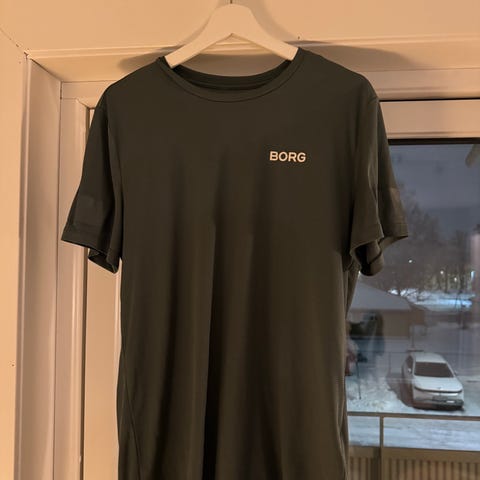 Björn Borg t-skjorte for herre i størrelse L. T-skjorten er svart med Björn Borg-logo på ermene. Kort erm og rund hals. Egnet til hverdagsbruk og trening.