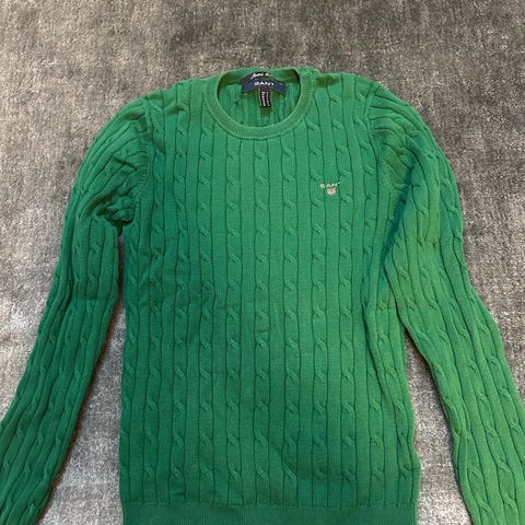 GANT genser for dame i størrelse S. Genseren er hvit og strikket i bomull med kabelstrikket mønster. Rund hals og ribbestrikkede kanter nederst og på ermene. Liten GANT-logo med skjold på brystet. Passer til hverdagsbruk og kan kombineres med både bukser og skjørt.