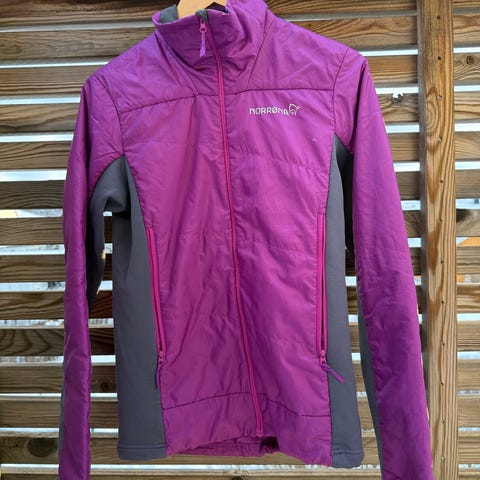 Jakka er lilla med mørkeblå felter. Pent brukt
