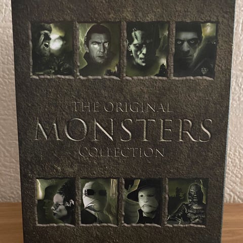 The Monster Legacy DVD Collection samleboks med klassiske monsterfilmer. Boksen inneholder filmer med figurene Frankenstein, Dracula og The Wolf Man. Emballasjen har vindu som viser byster av de tre karakterene på sokler. Format: DVD. Språk og regionkode er ikke oppgitt på bildene.