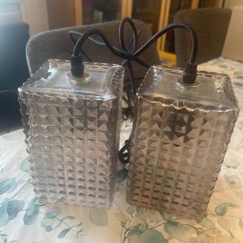 To stk taklamper i matt (hvitt) glass med ledninger. Diameter 15 cm. Selges samlet eller hver for seg.