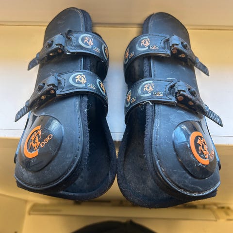 Det står ikke størrelse på dem, men brukt på full-hest, typ stor brun.