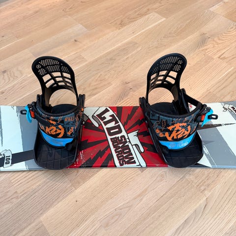 Snowboard med tilhørende bindinger og snowboardstøvler. Brettet er 95 cm og skoene str. 32/33,5.