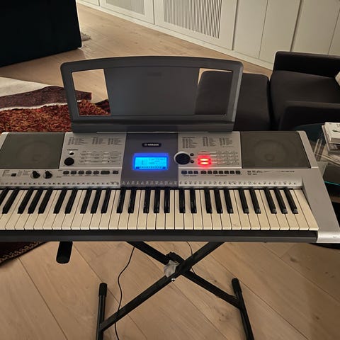 Yamaha PSR-E253 keyboard med 61 tangenter i svart utførelse. Modellen har innebygde høyttalere, LCD-skjerm og ulike funksjonsknapper for lyder, rytmer og innstillinger. Egnet for øving og generell musikkutøvelse hjemme eller i øvingsrom. Stativ følger med.