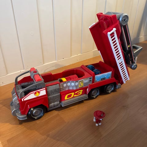 Selger en pent brukt, stor Paw Patrol brannbil. Alt funker som det skal. En liten Marshall figur, samt 2 vannkannoner og liten bil følger med. Stigen kan trekkes opp og ned. Se alle bildene. Med lyd og fargende blinklys.