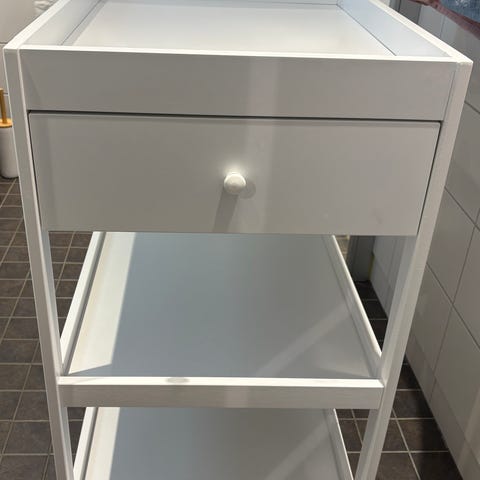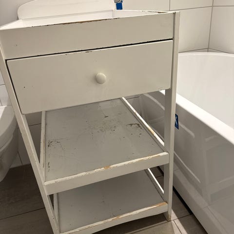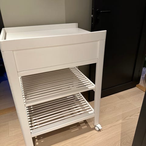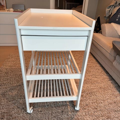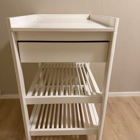 Troll stellebord i hvit utførelse. Stellebordet har en forhøyet kant rundt stelleflaten og en skuff under til oppbevaring av småting. Under skuffen er det to hyller med lameller som gir god plass til bleier, håndklær og annet utstyr. Stellebordet står på hjul for enkel flytting. Det er synlig slitasje og avskalling i overflaten enkelte steder, som vist på bildene.