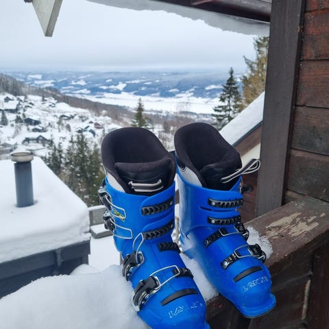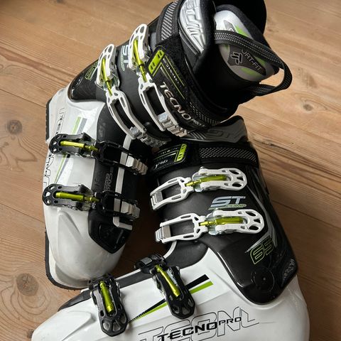 Nordica alpinstøvler i svart med røde og sølvfargede detaljer. Støvlene har fire justerbare spenner og kraftig stramrem øverst for god tilpasning rundt fot og legg. Innvendig har de rødt, polstret innerfôr som gir støtte og komfort. Passer til bruk i alpinbakke med standard alpinbindinger. Må hentes