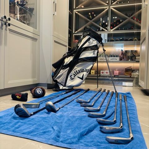 Pent golfsett med kjente merkevarer.
