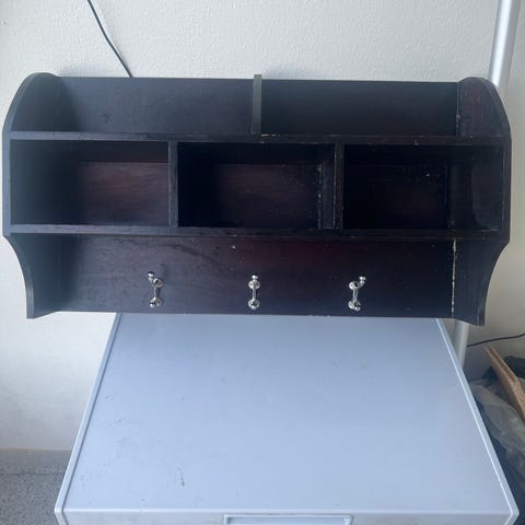 Hattehylle i sort smijern gis bort. Hylle på toppen, stang for hengere og kroker innerst.