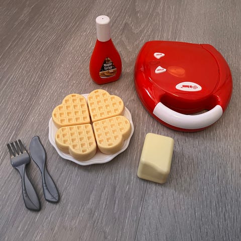 Lekemat med brett selges. Inneholder baguett, nuggets, pommes frittes, ketchup, is og drikkebeger i tillegg til brettet.