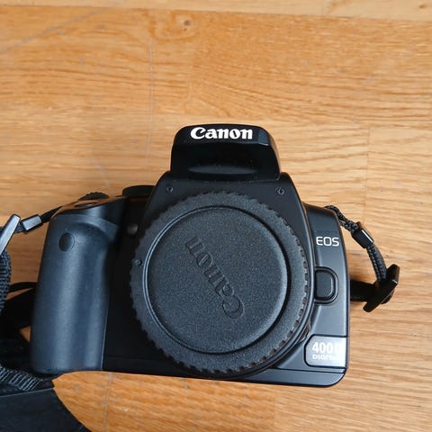 Canon EOS 400D digitalkamera med utskiftbart objektiv. Speilreflekskamera i svart med innebygd skjerm og betjeningshjul på toppen. Kameraet har standard Canon EF/EF-S-fatning for kompatible objektiver. Passer til generell fotografering som portretter, landskap og hverdagsbilder. Lader og minnekort følger med.