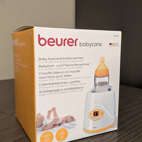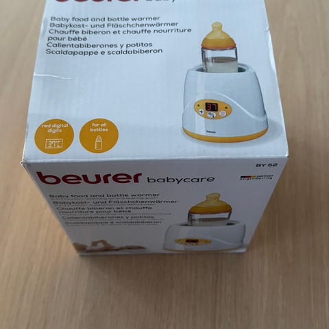Beurer flaskevarmer i hvit plast. Enheten er elektrisk med ledning og har kontrollpanel med display og knapper på forsiden. Egnet for oppvarming av tåteflasker og glass med babymat. Passer til bruk hjemme på kjøkkenbenk eller andre flate underlag der det er tilgang til strømuttak.