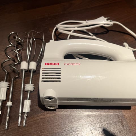 Bosch håndmikser i hvit plast. Leveres med to visper og to deigkroker i metall. Håndmikseren har flere hastighetsinnstillinger og egen knapp for utløsing av visper/deigkroker. Egnet til pisking, røring og elting av mindre deiger på kjøkkenet.