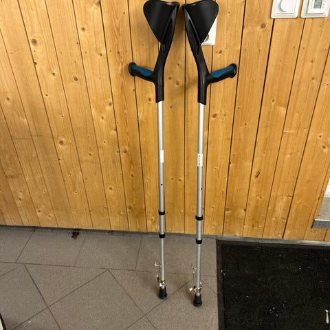 Krykker i grå farge med justerbar høyde. Underarmsstøtte og håndtak i plast, med gummifot nederst for bedre stabilitet. Egnet som ganghjelpemiddel ved midlertidig eller langvarig behov for avlastning av ben eller fot.