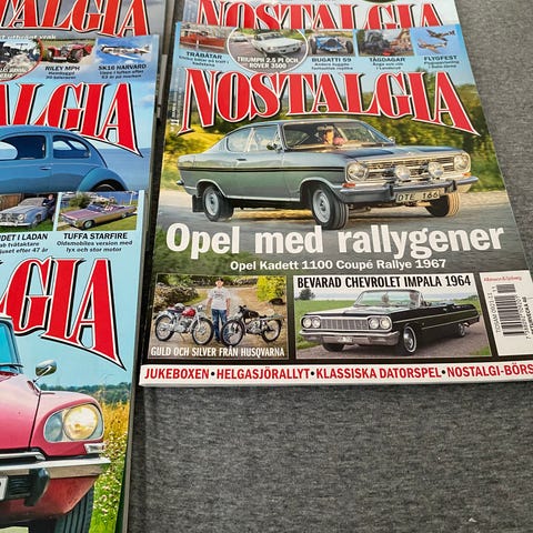 Nostalgia bilmagasin bladpakke med flere utgaver av magasinet Nostalgia. Forsidene viser klassiske biler som Ford Thunderbird, Cord 1936, Alfa Romeo Spider og Chevrolet 1958, samt en utgave med fokus på mahognybåter. Egnet for samlere eller for den som er interessert i klassiske biler og kjøretøyhistorie.