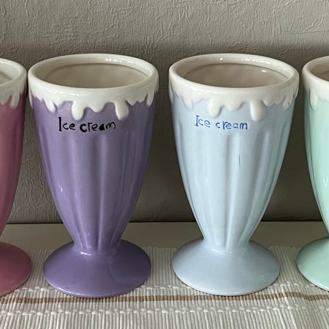Villeroy& Boch dessertskåler i porselen , fire stk. Skålene har bølget kant og fot, med ulike pastellfarger og kontrastfargede kanter. Utsiden har retroinspirerte motiver, innsiden er hvit. Høyden er ca. 9 cm og diameteren øverst er ca. 11 cm. Egnet til servering av dessert, is, frukt eller snacks ved borddekking i hverdagen eller til selskap.en 75.-kr pr stk