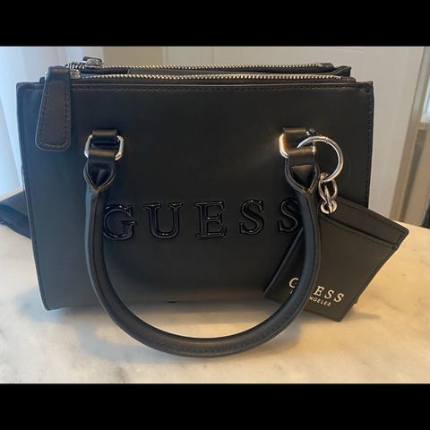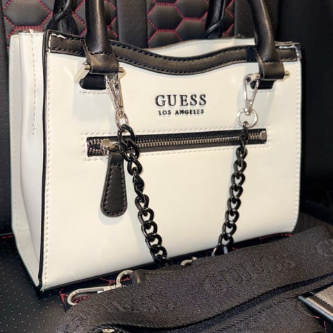 Guess håndveske for dame i burgunder kunstlær. Vesken har doble bærehåndtak og lukkes med glidelås. Innvendig er det flere adskilte rom med glidelås- og åpne lommer for organisering av innhold. På baksiden er det en ekstra utvendig glidelåslomme. Metall-detaljer i lys metallfarge og avtagbar dekorativ rem med metallanheng.