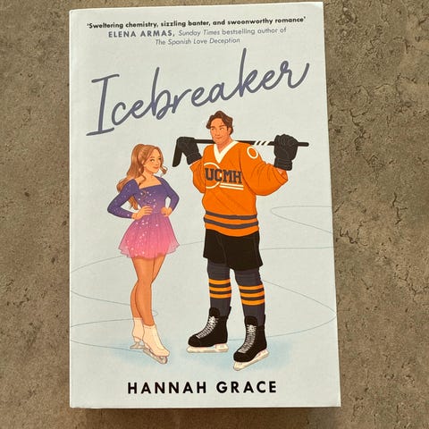 Hannah Grace Icebreaker bok. Roman på engelsk med illustrert forside som viser en kunstløper og en ishockeyspiller. Boken handler om livet ved universitetet, kunstløp og ishockey, og forholdet mellom hovedpersonene Anastasia Allen og Nate Hawkins. Paperback-utgave med tekst på engelsk.