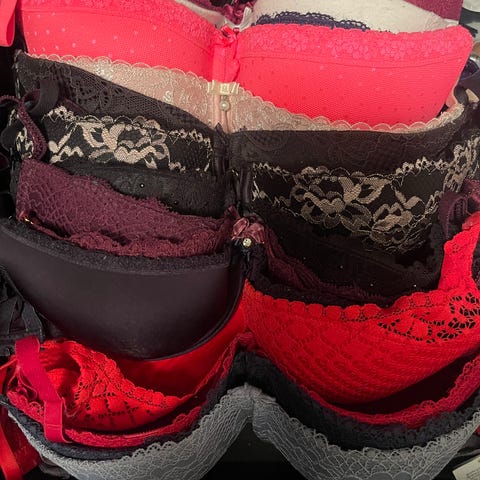 BH med lukking foran i grønn blonder, brun fløyel og flerfarget blomster. Lindex 'ella m' merke. Ikke synlig brukt.