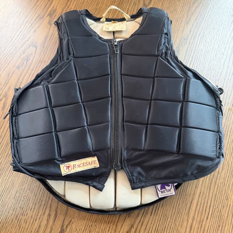 Vesten er en kroppbeskytter for ridning med segmenterte beskyttelsesplater. Den er merket med BETA-sertifisering og EN13158:2018 Level 3-standard. Yttermaterialet er tekstil med glidelåslukking foran og justeringsmuligheter i siden/nederkant.
