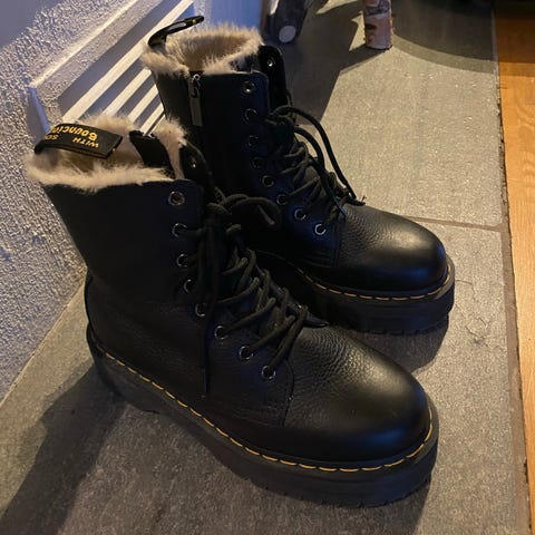 Dr. Martens støvler i størrelse 39. Støvlene er i svart skinn med snøring foran og karakteristiske gule sømmer langs sålen. Innvendig er de fôret med lyst, mykt materiale som gir ekstra varme. Yttersålen er mønstret og laget i slitesterkt gummimateriale. Passer som hverdagssko eller vintersko i kjøligere vær.
