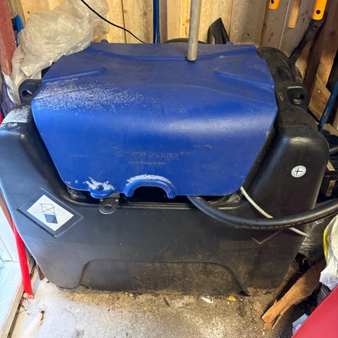 2 stk Ståltank på 1000L. Tanken har sylinderform med flate ender og er plassert på faste ben. På toppen er det flere tilkoblingspunkter og løfteører for håndtering.
