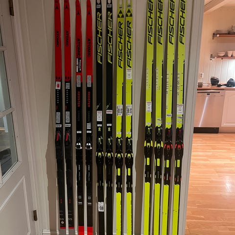 Tre par Fischer konkurranseski selges, alle lagret med glider, fra høyre: Fischer speedmax 3D classic plus 902 langrennsski med world cup bindinger, lengde 207, tatt ut til løper 70 kg men kan brukes av løper noen kg opp eller ned. Passer fint til fast føre, gjerne violet 0 til -7ish. Skiene er merket med slip «blå» fra Milsukern datert februar 2024. Pent og lite brukt (kun konkurranse) og minimalt med bruksmerker, selges kr 5200. Bra klisterpar 3D 902 plus i midten, merket for løper 70 kg, har hatt veldig god glid på disse, med world cup bindinger, pent brukt kun i konkurranse, lengde 202, selges kr 3500. Fischer speedmax zero+3D, brukt kun i konkurranse, passer til løper pluss minus 70 kg, lengde 207, selges kr 3300.