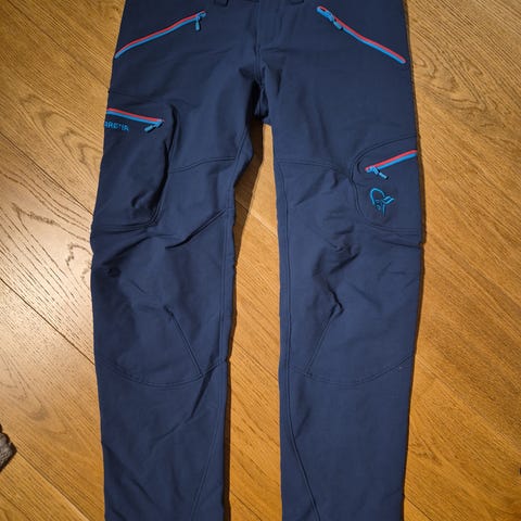 Norrøna bukse i softshell-materiale i mørk blå farge med blå kontrastdetaljer. Buksen har glidelåslomme på låret foran og trykt Norrøna-logo. Den er laget hovedsakelig av polyamid med elastan for stretch, og har meshfelt og fôrede lommer i polyester. Egnet som tur- og friluftsbukse i variert vær. Unisex passform kan passe både til dame og herre, avhengig av størrelse.