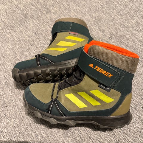 Adidas Terrex Rain Rdy terrengsko / tursko for barn, størrelse 37. Skoene har overdel i tekstil med syntetiske forsterkninger og snøring foran. Fargen er hovedsakelig rød med mørke og lyse detaljer samt hvite lisser. Yttersålen har mønster som gir godt grep.