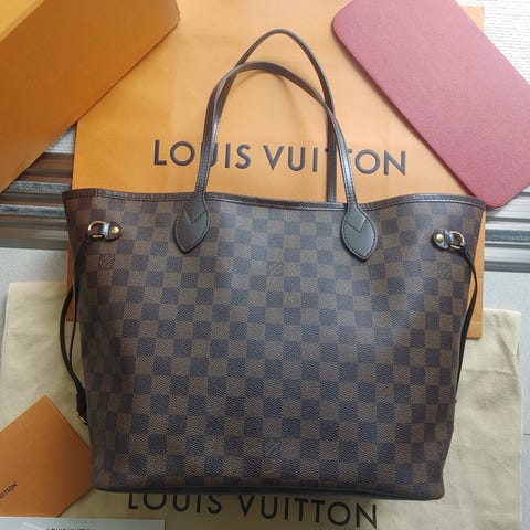 Pent brukt Louis Vuitton Neverfull MM i Damier Ebene, opprinnelig kjøpt i 2017.