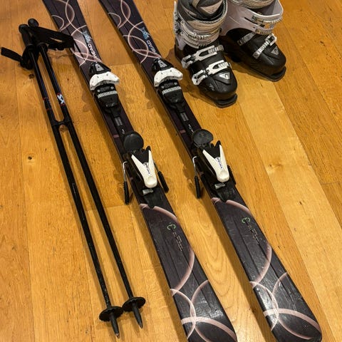 Lengde på ski er 147cm, skoene passer en som bruker str 38 (står ikke størrelse inni).