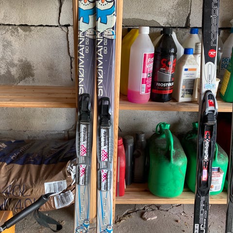 Rossignol R-Skin langrennski med integrerte feller og monterte bindinger. Skiene er klassiske langrennski med fell under festesonen for godt feste uten bruk av festesmøring. Lengden er 190cm, og skiene har hvit og grønn dekor med svart bindingssystem. Bildene viser også et par svarte Alpina langrennsstøvler str 38 som er tilpasset samme bindingssystem, samt et par svarte langrennsstaver. Utstyret egner seg til klassisk langrenn på preparerte løyper.